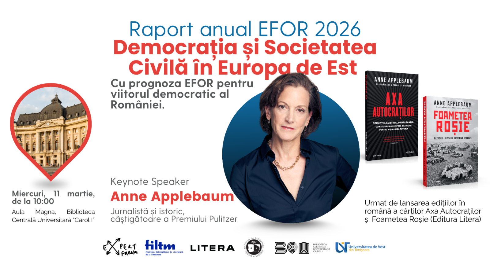 Miercuri, 11 martie, ora 10.00, în Aula Bibliotecii Centrale Universitare Carol I (Calea Victoriei nr.88), Anne Applebaum va fi prezentă la prezentarea Raportului anual EFOR 2026. Democrația și societatea civilă în Europa de Est, realizat de Expert Forum (EFOR), ocazie cu care va participa la un dialog cu Sorin Ioniță despre traiectoria democrației în regiunea noastră. Ulterior vor fi lansate volumele Axa autocraților. Corupție, control, propagandă: cum se sprijină reciproc dictatorii pentru a-și păstra puterea și Foametea roșie. Războiul lui Stalin împotriva Ucrainei, ambele recent publicate în colecția Kronika a Editurii Litera. În încheiere, autoarea va interacționa cu publicul și va participa la o sesiune de autografe.