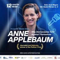 Joi, 12 martie, ora 18.00, la invitația Universității de Vest din Timișoara, Anne Applebaum se va afla într-un dialog cu jurnalistul Marian Voicu. Evenimentul, intitulat Why Democracies Turn Against Themselves și desfășurat în Aula Magna a Universității de Vest din Timișoara (Bld. Vasile Pârvan nr.4), propune o analiză lucidă asupra fragilității democrațiilor contemporane, ascensiunii autoritarismului și responsabilității societăților libere într-un context internațional marcat de tensiuni și transformări profunde.