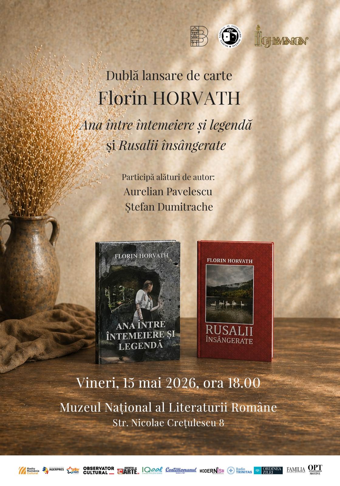 Muzeul Național al Literaturii Române găzduiește vineri, 15 mai 2026, ora 18.00, în Sala Perpessicius (Str. Nicolae Crețulescu nr. 8), evenimentul de lansare a două volume semnate de Florin Horvath: „Ana, între întemeiere și legendă” și „Rusalii însângerate”, apărute la Editura Ighemonicon, care continuă explorarea relației dintre istorie și legendă a autorului, propunând cititorilor o incursiune în zonele sensibile ale memoriei culturale și ale imaginarului colectiv.