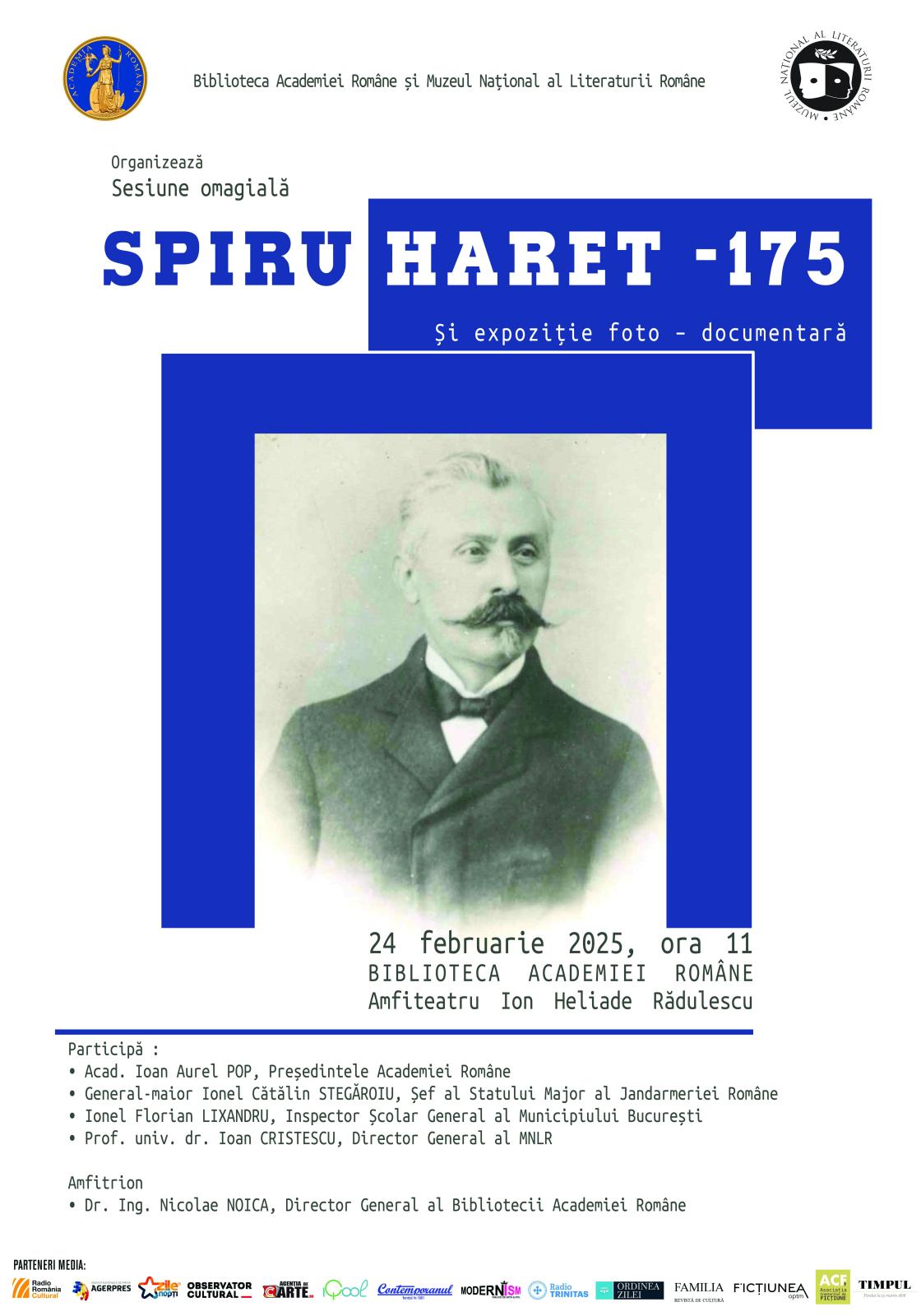 La împlinirea a 175 de ani de la nașterea omului de știință și politicianului Spiru Haret (1851-1912), Biblioteca Academiei Române organizează, în colaborare cu Muzeul Național al Literaturii Române, în data de 24 februarie a.c., o sesiune omagială consacrată ilustrului cărturar al cărui nume a devenit un reper în modernizarea și dezvoltarea învățământului românesc. Manifestarea va avea loc în Amfiteatrul „Ion Heliade Rădulescu” din cadrul B.A.R. de la ora 11.00.
