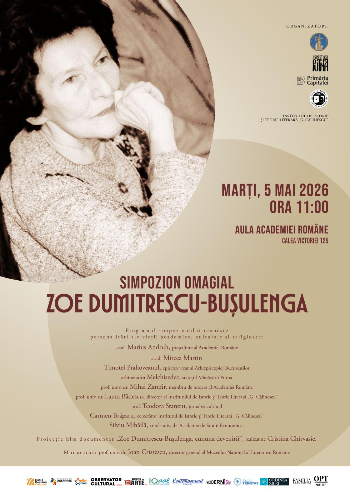 Academia Română, Mănăstirea Putna, Muzeul Naţional al Literaturii Române şi Institutul de Istorie şi Teorie Literară „George Călinescu” vă invită marți, 5 mai 2026, de la ora 11.00, în Aula Academiei Române, Calea Victoriei 125, la un simpozion dedicat personalității remarcabile a culturii române, Zoe Dumitrescu-Bușulenga – critic și istoric literar, eseist, profesor universitar și membru marcant al Academiei Române.