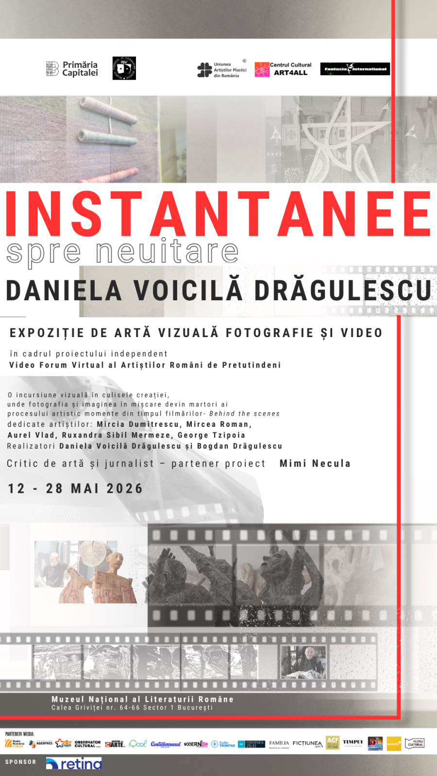 Centrul Cultural ART4ALL, în parteneriat cu Muzeul Național al Literaturii Române, organizează, în perioada 12 – 28 mai 2026, la sediul MNLR din Calea Griviței 64-66, în cadrul proiectului Video Forum Virtual al Artiștilor Români de Pretutindeni, conceput și realizat de Daniela VOICILĂ DRĂGULESCU și Bogdan DRĂGULESCU, expoziția „Instantanee spre neuitare” cu imagini realizate în timpul filmărilor dedicate ilustrării destinelor creative a unora dintre cei mai prolifici plasticieni contemporani: Mircia Dumitrescu, Mircea Roman, Aurel Vlad, Ruxandra Sibil Mermeze și George Tzipoia.