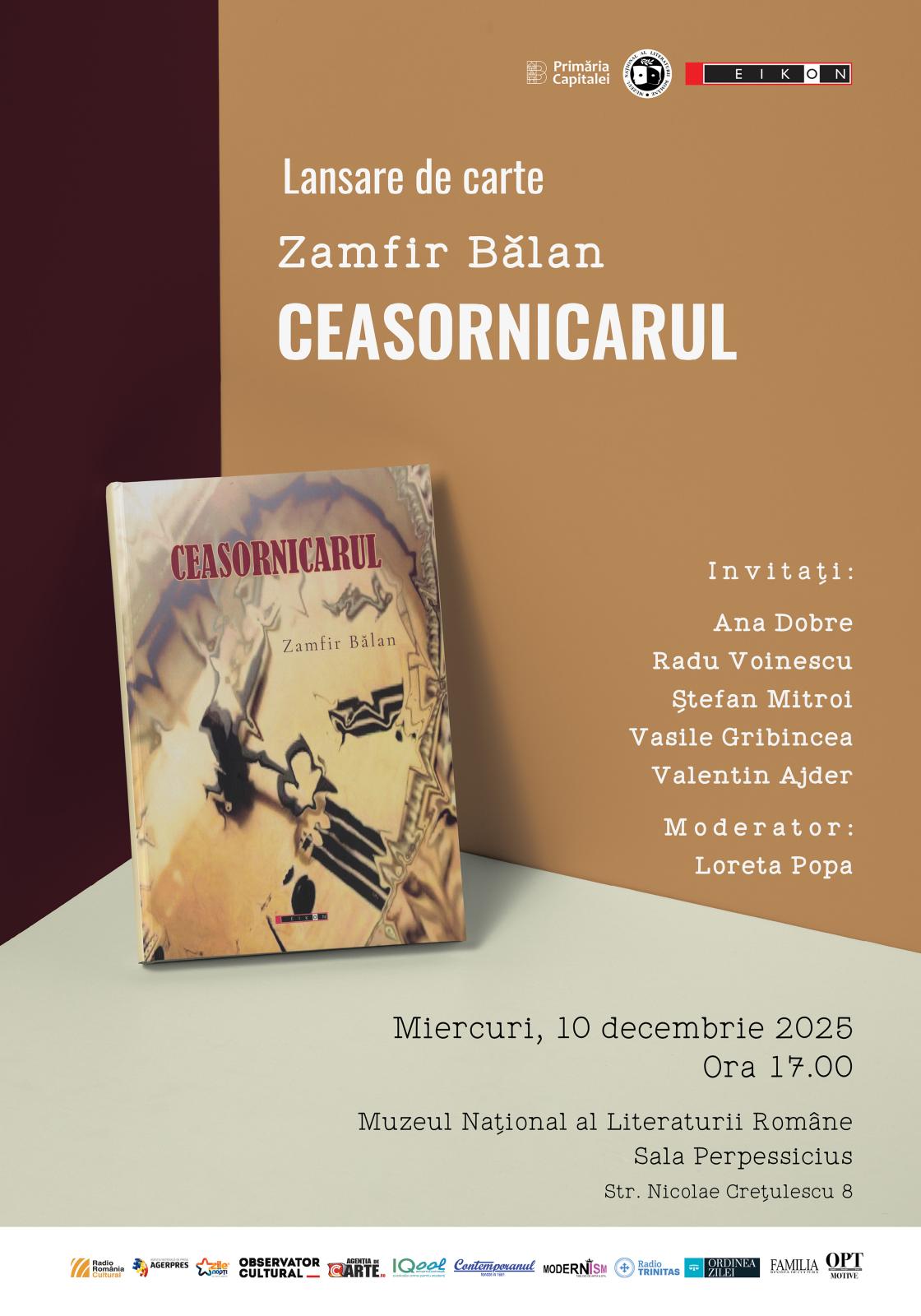 Muzeul Național al Literaturii Române vă invită miercuri, 10 decembrie a.c., la ora 17.00, la sediul din strada Nicolae Crețulescu nr. 8, în Sala „Perpessicius”, la lansarea volumului „Ceasornicarul”, semnat de scriitorul Zamfir Bălan, apărut la Editura EIKON.