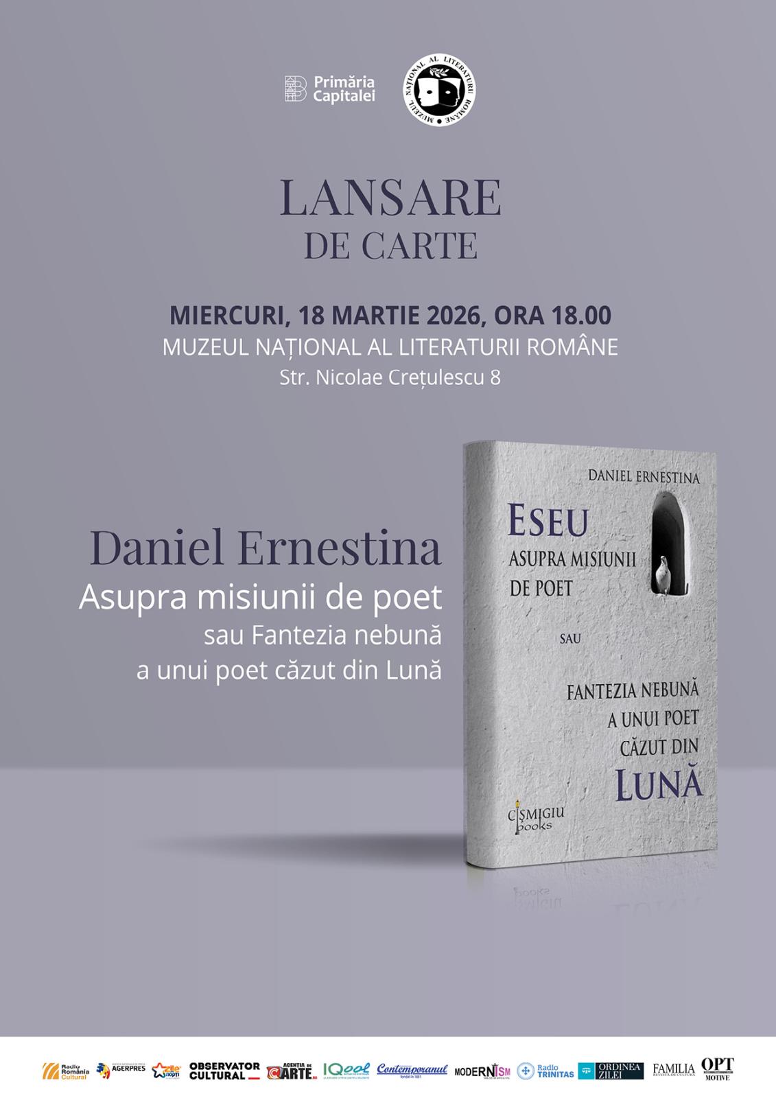 Muzeul Național al Literaturii Române găzduieşte miercuri, 18 martie 2026, ora 18.00, lansarea volumului „Eseu asupra misiunii de poet”, semnat Daniel Ernestina.