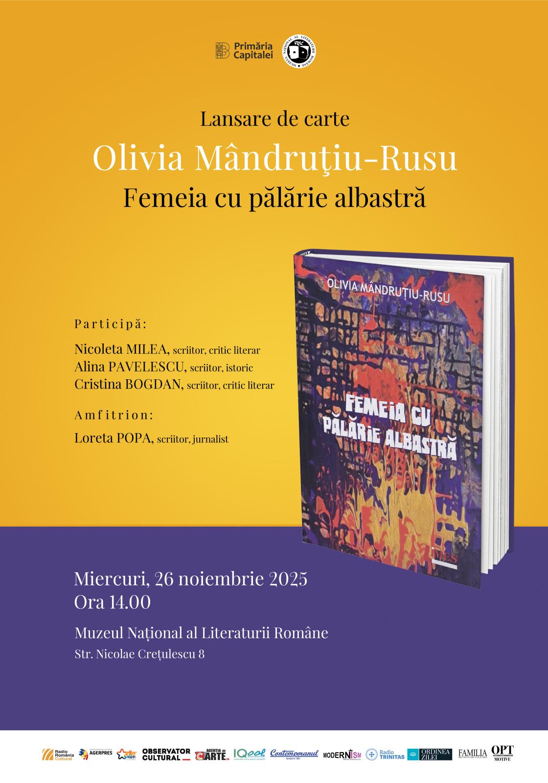 Muzeul Național al Literaturii Române vă invită miercuri, 26 noiembrie 2025, de la ora 14.00, la lansarea volumului „Femeia cu pălărie albastră”, apărut la Editura LIMES, purtând semnătura Oliviei Mândruțiu-Rusu. Evenimentul va avea loc în Sala Perpessicius, Str. Nicolae Crețulescu nr. 8.