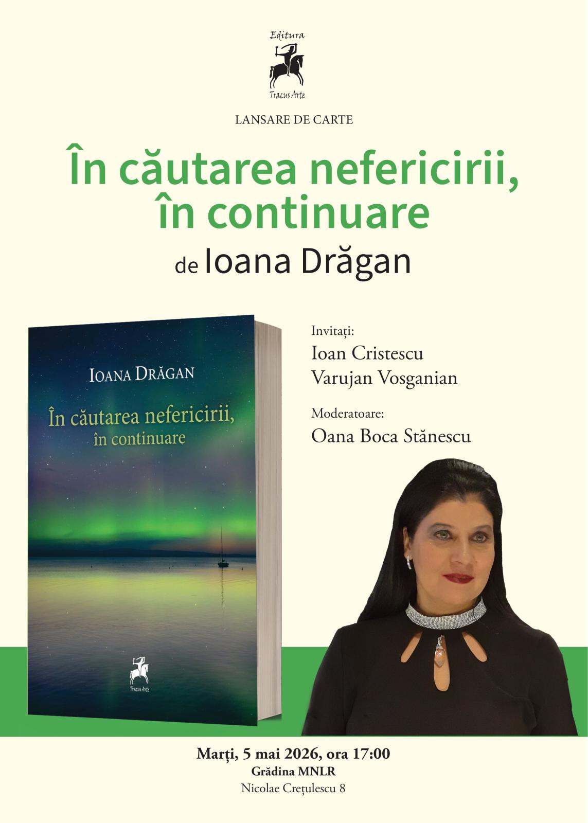 Ioana Drăgan își invită cititorii la lansarea celui mai recent roman, „În căutarea nefericirii, în continuare”, publicat la Editura Tracus Arte. Evenimentul va avea loc marți, 5 mai 2026, începând cu ora 17.00, în Grădina Muzeului Național al Literaturii Române, Str. Nicolae Crețulescu 8.