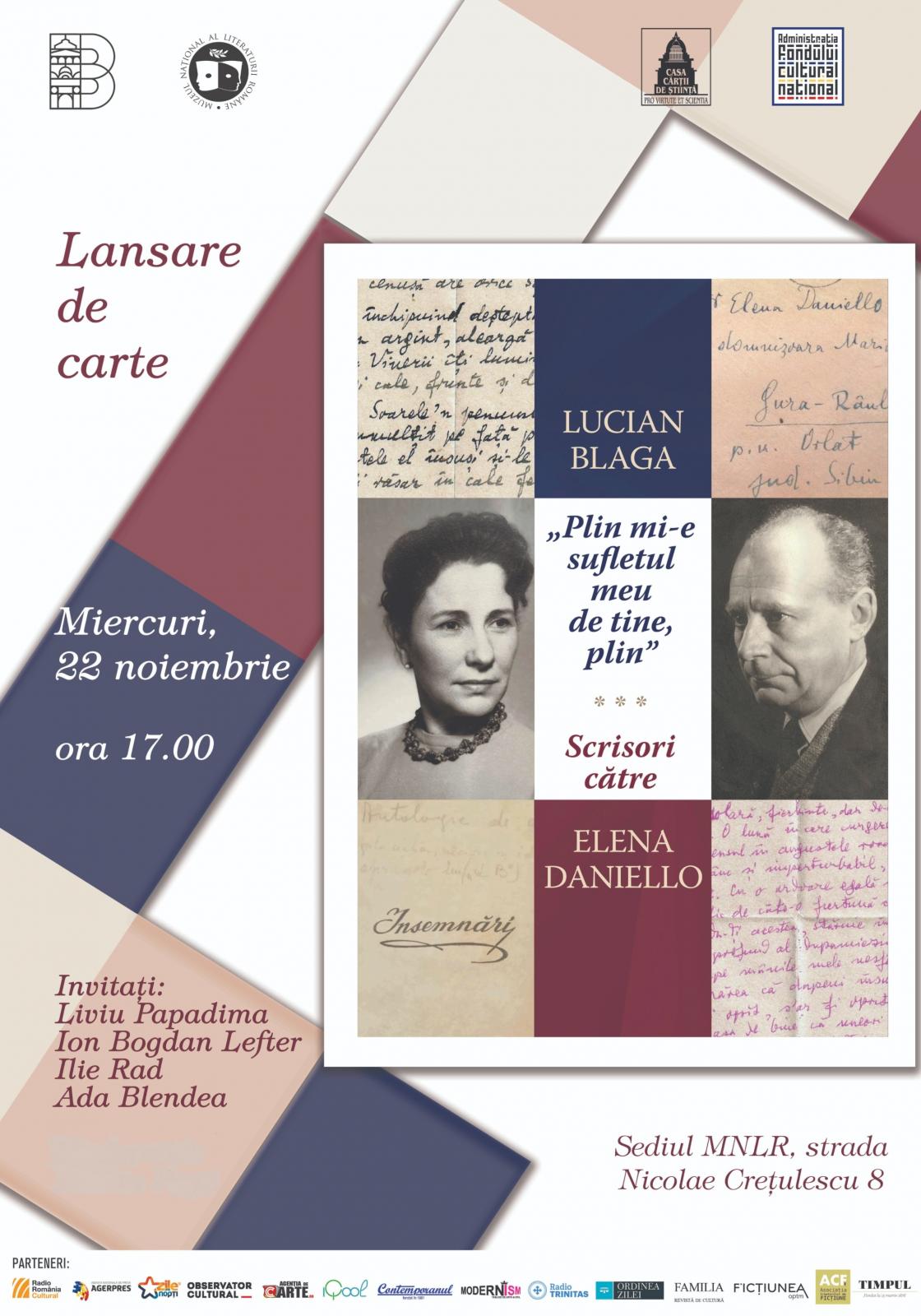 Muzeul Național al Literaturii Române și Editura Casa Cărții de Știință vă invită miercuri, 22 noiembrie 2023, ora 17.00, la sediul din Strada Nicolae Crețulescu 8, la evenimentul de lansare a volumului Lucian Blaga „Plin mi-e sufletul meu de tine, plin. Scrisori către Elena Daniello”.