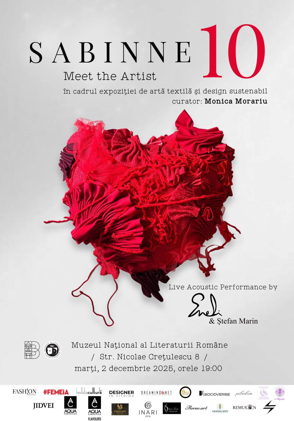 Marți, 2 decembrie 2025, ora 19:00, la sediul Muzeul Național al Literaturii Române din str. Nicolae Crețulescu 8, va avea loc evenimentul SABINNE 10 – Meet the Artist, în cadrul expoziției SABINNE 10, deschisă în colecția de bază a muzeului, în data de 19 noiembrie. Este un eveniment aniversar menit să celebreze cei 10 ani de creație vestimentară autentică, sustenabilă și inovativă, din cariera Sabinei Georgescu, artist vizual, designer, doctorand al Universității Naționale de Arte București, multiplu premiată internațional în competiții de profil și prezentă pe scena expozițională și în cadrul evenimentelor de modă din țară și din străinătate.