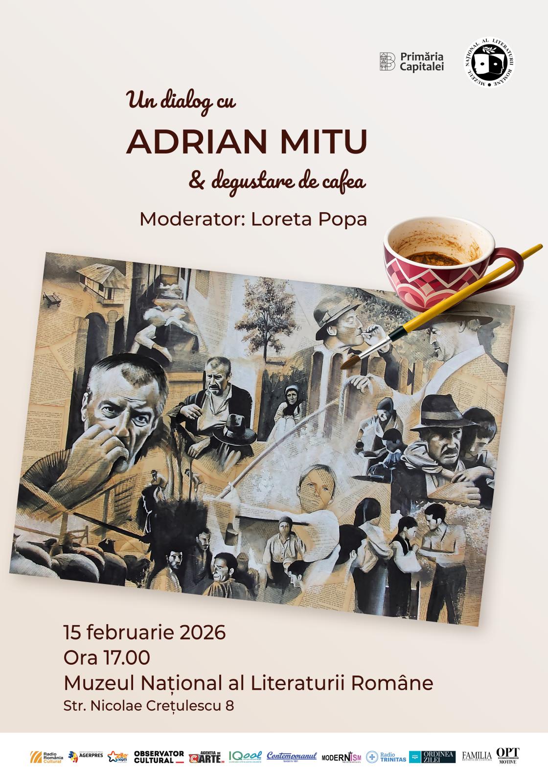 Muzeul Național al Literaturii Române vă invită duminică, 15 februarie 2026, în intervalul 17.00 – 18.00, la sediul din Str. Nicolae Crețulescu nr. 8, la o întâlnire specială cu artistul Adrian Mitu, urmată de o degustare de cafea.